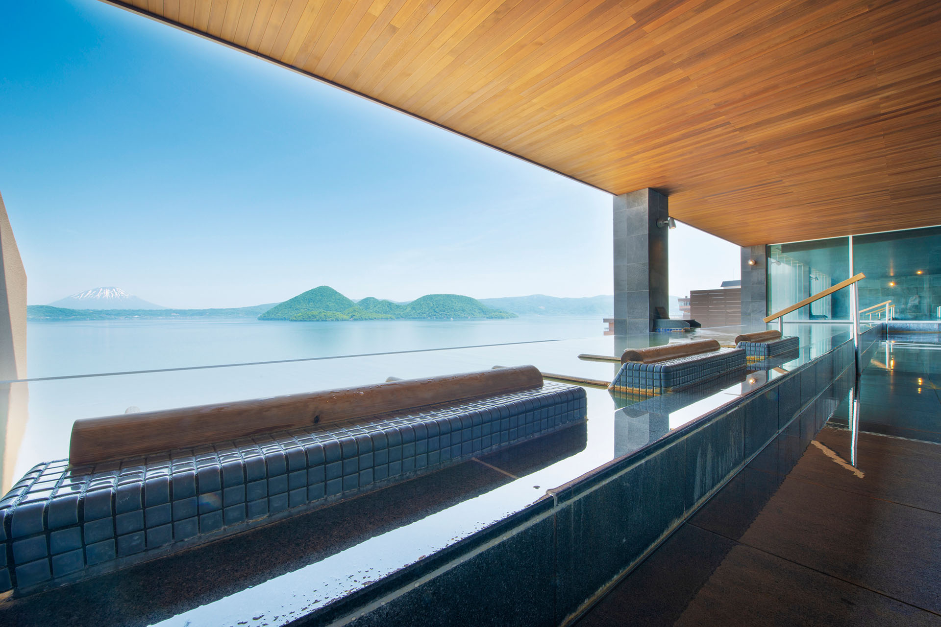 Nakajima Island floating on Lake Toya, the Espoir sightseeing boat, and the beautiful shape of Mt. Yotei. The large public bath on the top floor of the West Wing, "Hoshi no Yu," offers a dynamic view of Lake Toya from an infinity open-air bath that stretches out before your eyes.