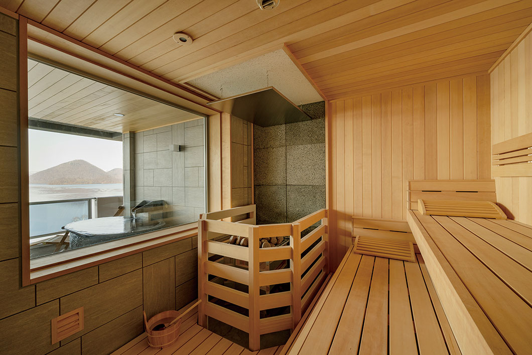 A must-try is the "Private Panoramic Sauna Room + Western-style Room with Hot Spring Panoramic Bath." This premium space is the only one of its kind, and comes with a private sauna with a large window overlooking Lake Toya and Mount Yotei, also known as the Ezo Fuji. The terrace is an open-air bathing space with a cold bath and reclining chairs. You can enjoy the ultimate "relaxing experience" by enjoying the view of Lake Toya, the self-loyly sauna, and the hot springs at your leisure.