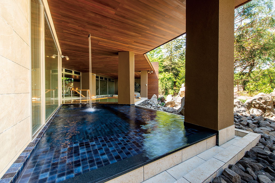 The sauna room in the large bath "Tsuki no Yu" on the first basement floor is 20 square meters in size. It was supervised by professional sauna user Dai Matsuo. He recommends this unique sauna, saying, "It's the ideal wet and mild sauna! The water quality in the cold bath is excellent, the temperature is ice cold, the stones in the garden are wonderful, and the view is perfect. Imagine coming out of the sauna sweating and then jumping into that cold bath... that kind of fantasy will make your steaming time even more comfortable!" In addition, the "Giant Rock Garden" that you can view was supervised by landscape gardener Shigeo Yamada.